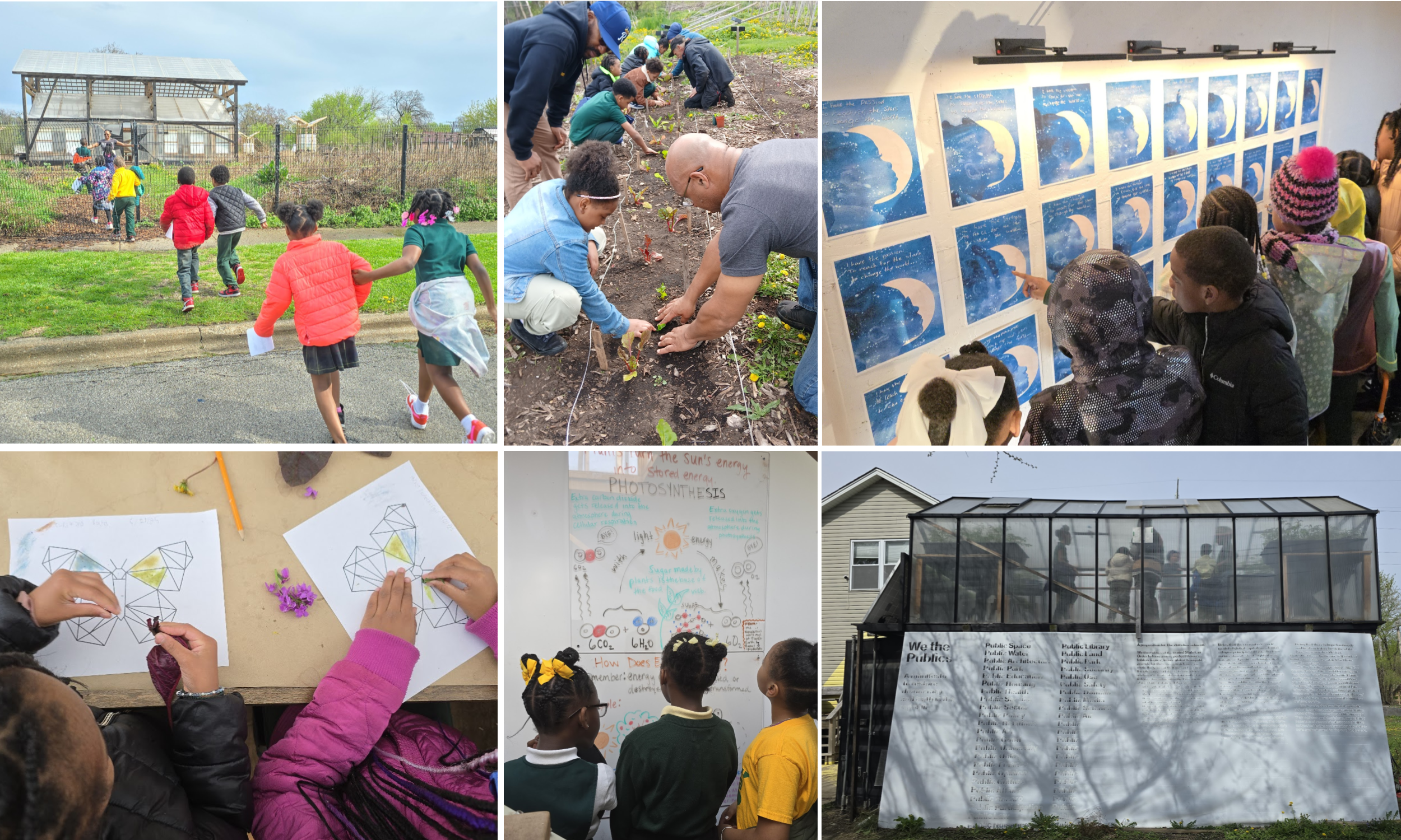 A key part of their spring experience was understanding the sun’s role in generating energy. They experienced the sun's warmth firsthand in greenhouse spaces like the Work-Shop, Hoop Houses, and SmartPod and saw how the sun is a vital to photosynthesis - the process of transforming energy from the sun into food for the plants, which is necessary for plant growth, including growing food. They saw how the SmartPod’s solar panels harnessed the sun's energy to charge a battery for lights. They gained new energy from the Green Sun Smoothie, made with fresh greens from the Community Farm, with a blender powered with solar energy. The academic year culminated in a celebration at the Sankofa Living Memories Civic Arts Project in the Civic Arts Church, where their watercolors, handwriting, and silhouettes from February were proudly displayed on the Community Connections wall.